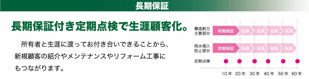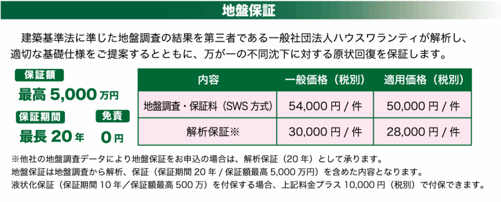 全建工匠基準で建設した住宅仕様で、住宅瑕疵担保保険、長期保証、地盤保証の保険料割引等の制度がご利用できます。